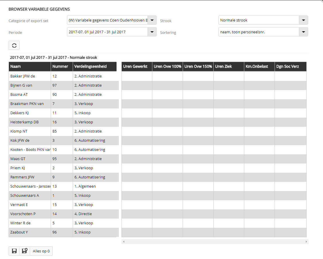 De browser variabele gegevens vereenvoudigt de invoer van variabele gegevens en is tevens terug te vinden op het startscherm van de werkgever. In deze browser kan gebruik worden gemaakt van de hierboven beschreven exportsets (zie ook: Variabele gegevens: Exportsets definiëren). Nadat een categorie of exportset is geselecteerd, moet het scherm worden ververst,
