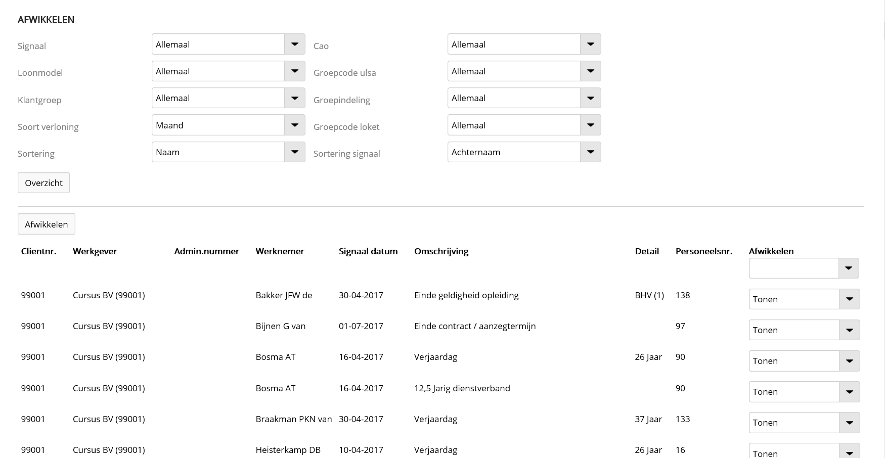 Via de optie Collectief -> Signalen-> Output (selectie op groepsindeling) kan een gebruiker met behulp van dit overzicht voor alle werkgevers waartoe de gebruiker toegang heeft de opstaande signalen beoordelen en eventuele vervolgacties uitvoeren.