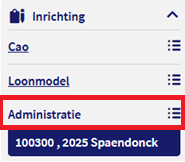 Hiermee open je de lijst met werkgevers waartoe je geautoriseerd bent. Om de inrichtingskant van een werkgever te bekijken, klik je aan de linkerkant op Inrichting - Administratie. Hier is de werkgever ook met het zoekveld of het lijst-icoon op te roepen.