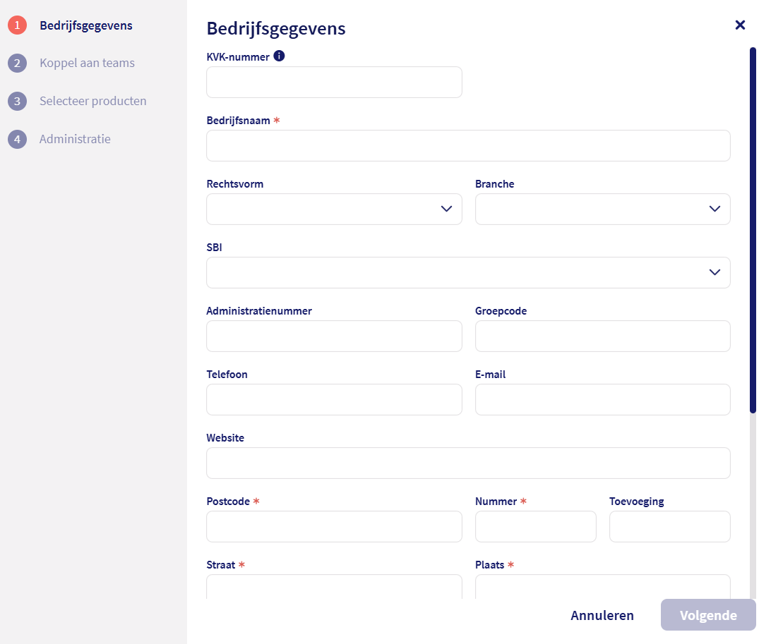 Als eerste ga je de basisgegevens van de werkgever toevoegen. Bovenaan de wizard is het veld KVK-nummer geplaatst. Loket haalt d.m.v. een koppeling met de Kamer van Koophandel diverse gegevens van de werkgever geautomatiseerd op. Met de knop Volgende ga je naar stap 2 van de wizard.