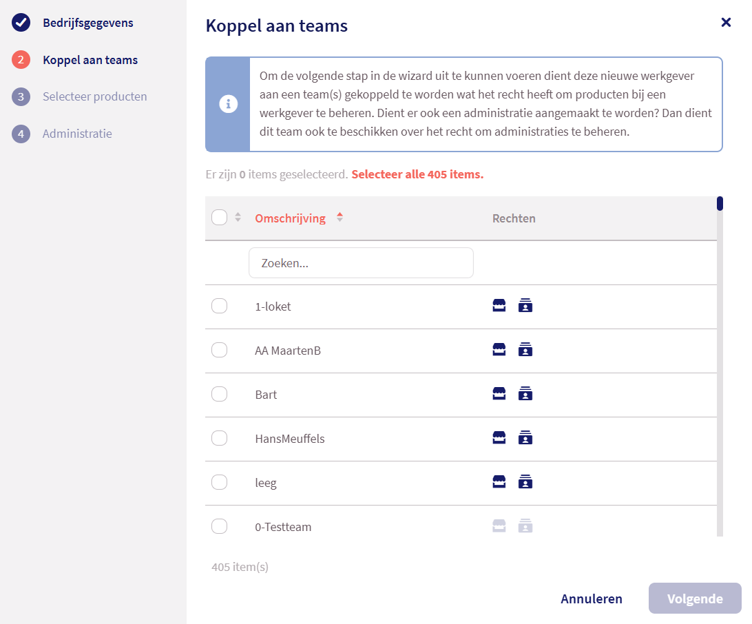 Bij stap 2 voeg je de werkgever toe aan één of meerdere teams waarvan de teamleden geautoriseerd zijn om de nieuwe werkgever in te zien. De gekoppelde teams dienen ook te beschikken over het recht Beheer administratie om ook daadwerkelijk de laatste stap van wizard uit te mogen voeren.