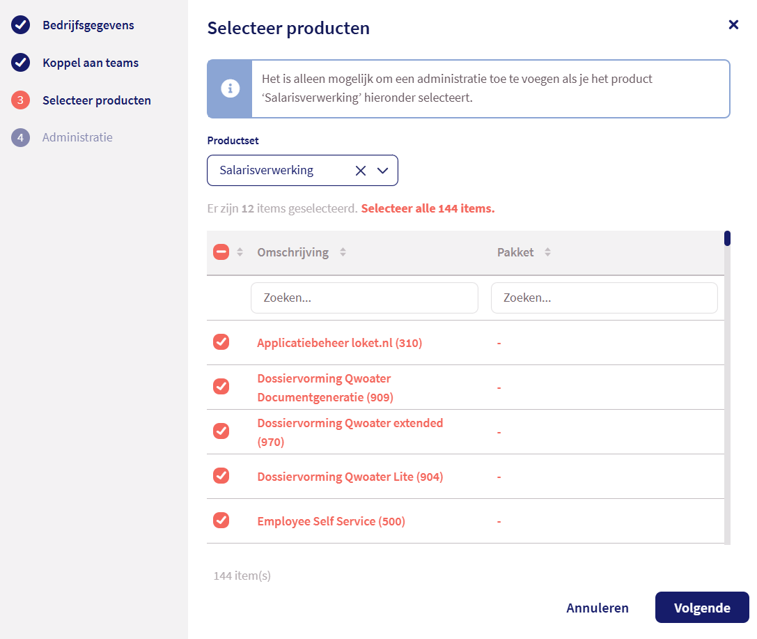 Bij stap 3 selecteer je met behulp van een voor gedefinieerde productset of handmatig de verschillende producten die je voor deze werkgever wenst te gebruiken. De producten zijn de modules of functionaliteiten in Loket. Het is alleen mogelijk om de laatste stap van de wizard uit te voeren wanneer je product Salarisverwerking (40) geactiveerd hebt.