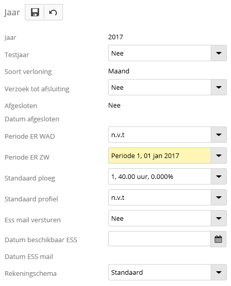 Op administratieniveau kunnen onder Algemeen -> Inrichting -> Jaar de standaard ploeg en standaard profiel gedefinieerd worden. Deze waarden zullen bij het toevoegen van een nieuwe werknemer in Loket als default waarde worden gepresenteerd. Ook bestaat in dit scherm de mogelijkheid om voor de werknemers, die toegang hebben tot ESS, aan te geven dat bij het beschikbaar zijn van de jaaropgave deze werknemers een e-mailbericht moeten ontvangen (indicatie Ess mail versturen). Als ESS mail versturen op Ja staat, zal Loket een e-mail versturen op de datum welke vermeld is in het veld Datum beschikbaar ESS. Indien hier geen datum wordt opgegeven, zal de datum van de jaarafsluiting gebruikt worden. In het veld Datum ESS mail zal automatisch de datum worden vastgelegd waarop het e-mailbericht t.b.v. de jaaropgave is verstuurd.