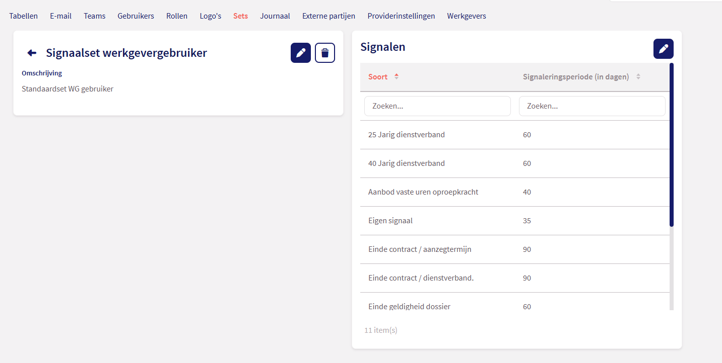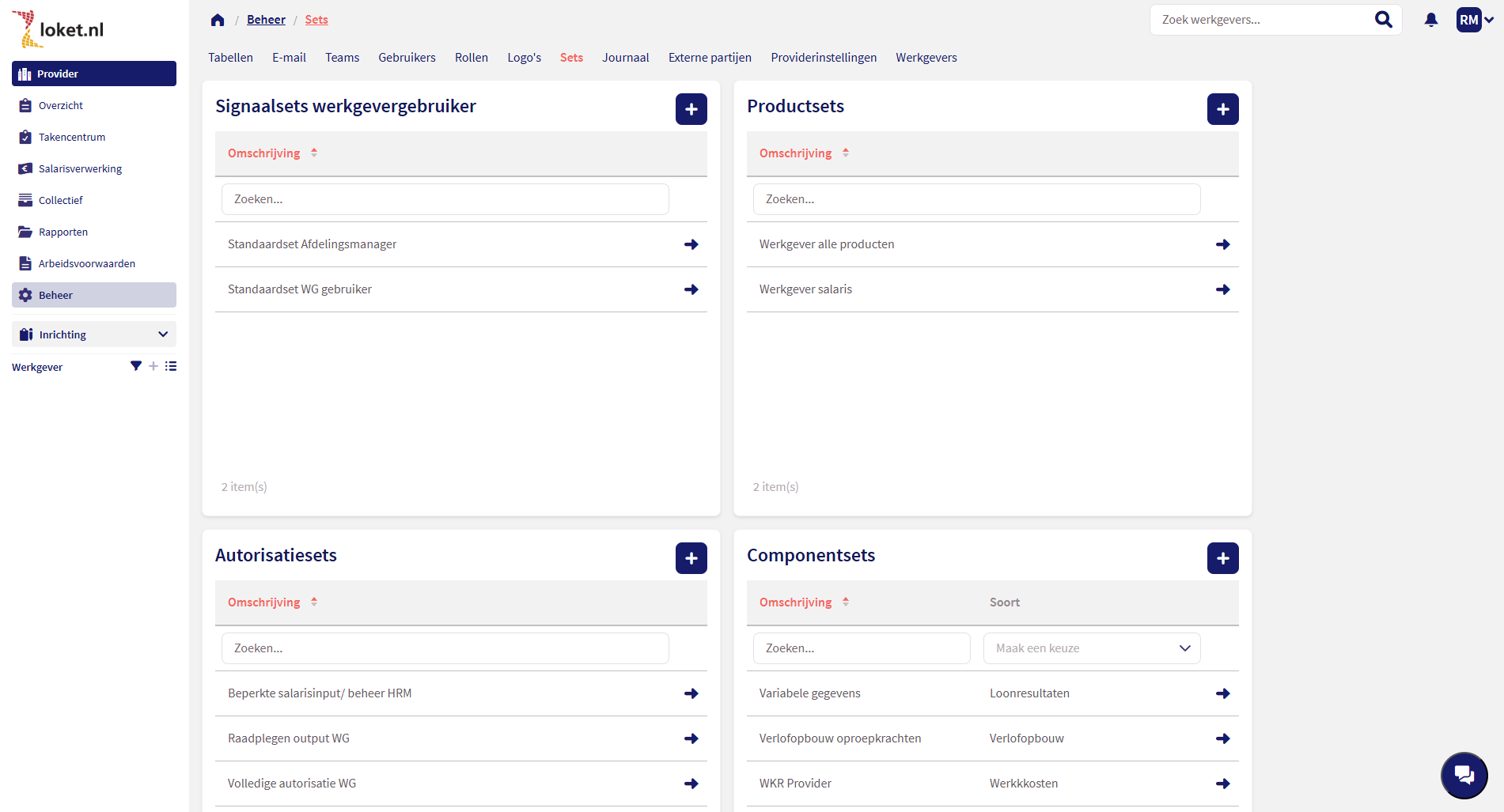 In Loket is het mogelijk op providerniveau productsets, autorisatiesets en signaalsets te definiëren. Hierdoor kan bij een werkgever, team of gebruiker snel een aantal vooraf bepaalde producten of rechten worden toegevoegd. De signaalsets zijn uitsluitend bedoeld voor de werkgevergebruikers.