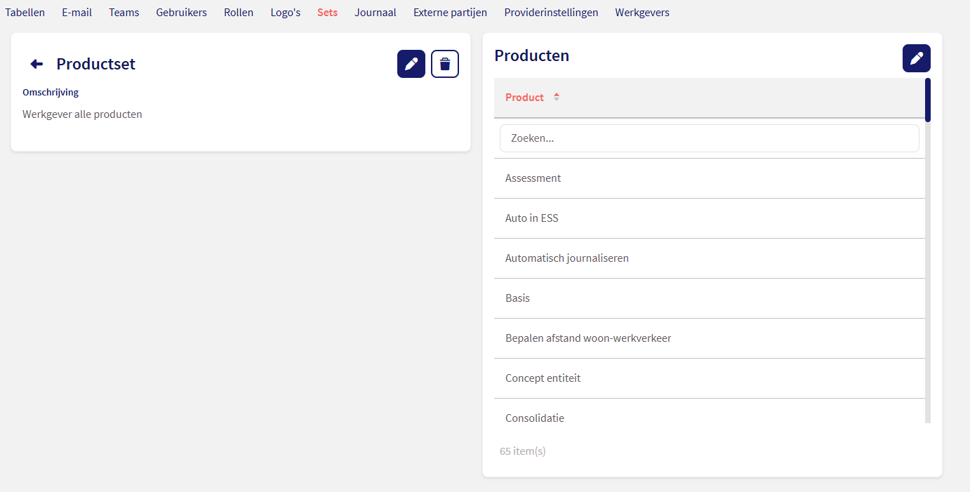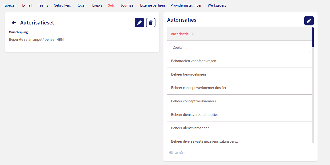 Allereerst dienen de diverse sets te worden bepaald. Onder Beheer -> Sets -> Autorisatieset, Productsets en Signaalsets werkgevergebruiker kun je per set de rechten en producten selecteren. Het is mogelijk om meerdere sets per provider te definiëren.