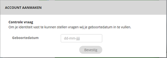 Klik in de link die je via e-mail hebt ontvangen van je werkgever. Om een extra controle uit te voeren, wordt er gevraagd naar je geboortedatum.Vul in het onderstaande scherm je geboortedatum in.