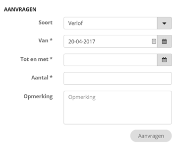 In het Werknemerloket kun je direct een verlofaanvraag indienen vanaf de startpagina of via de menuoptie HRM - Verlof - Onder het kopje Aanvragen.