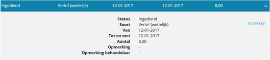 Via de menuoptie HRM - Verlof - Onder Overzicht verlofaanvragen kun je de ingediende verlofaanvra(a)g(en) raadplegen en intrekken. Als je de betreffende verlofaanvraag aanklikt en kiest voor Intrekken wordt de ingediende verlofaanvraag ingetrokken.