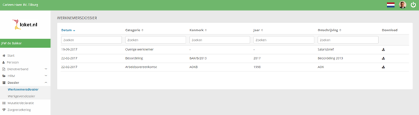 Je werkgever heeft de mogelijkheid om alle documenten zoals arbeidsvoorwaarden, bedrijfsreglementen en cao-teksten met je te delen in het werkgeversdossier en je persoonlijke documenten in het werknemersdossier zoals arbeidscontract, kopie legitimatie en leasecontract. Als je werkgever hiervoor gekozen heeft, zie jij de menuoptie Dossier staan. Als je klikt op Dossier heb je de keuze uit Werkgeversdossier en Werknemersdossier. Het werkgeversdossier zijn de algemene documenten en het werknemersdossier je persoonlijke documenten.