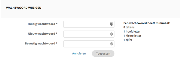 In het onderstaande scherm kun je je wachtwoord wijzigen. Vul je huidige wachtwoord in en vervolgens je nieuwe wachtwoord en ter bevestiging nogmaals je nieuwe wachtwoord. Klik op Toepassen en je wachtwoord is gewijzigd.