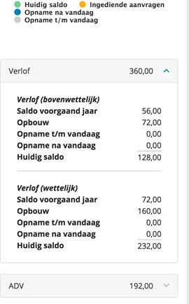 Door onder de cirkel te klikken op het verlof zie je direct hoeveel wettelijke en bovenwettelijke verlof uren je hebt.