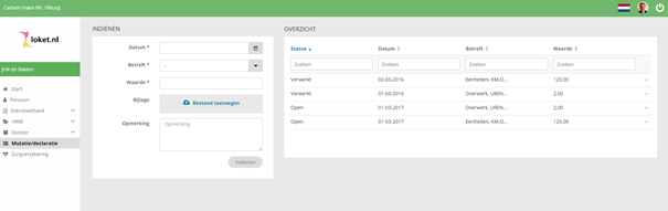 Je hebt deze optie alleen als je werkgever dit heeft geactiveerd. Als het geactiveerd is, zie je in het menu de optie Mutatie/declaratie. Als je hierop klikt, kom je in het onderstaande scherm terecht: