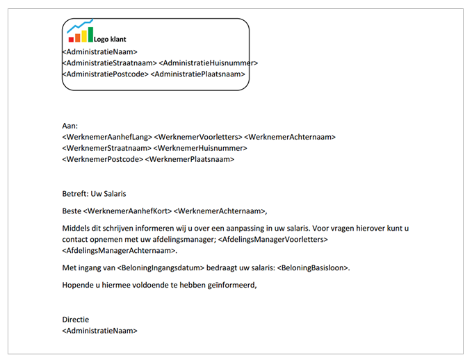 Door specifieke placeholders te gebruiken, verwerk je bijvoorbeeld de voornaam, achternaam of geboortedatum op de juiste plaats in de template. De placeholders zijn in het document te herkennen aan de tekst die tussen de volgende tekens staat: <Voorbeeld>