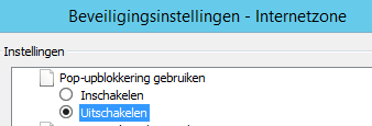 Indien de blokkering nog steeds wordt toegepast, ga je naar het scherm Extra -> Internetopties -> Beveiliging en de button Aangepast niveau…Hier kies je bij Pop-upblokkering gebruiken voor Uitschakelen.