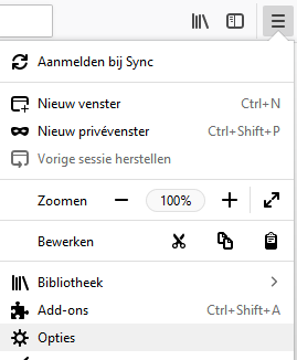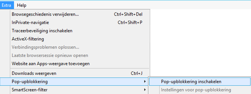 Controleer eerst of de pop-upblokkering uitgeschakeld is. Ga hiervoor in de webbrowser naar Extra (zie onderstaande schermprint) of naar het tandwieltje rechts boven in het scherm.