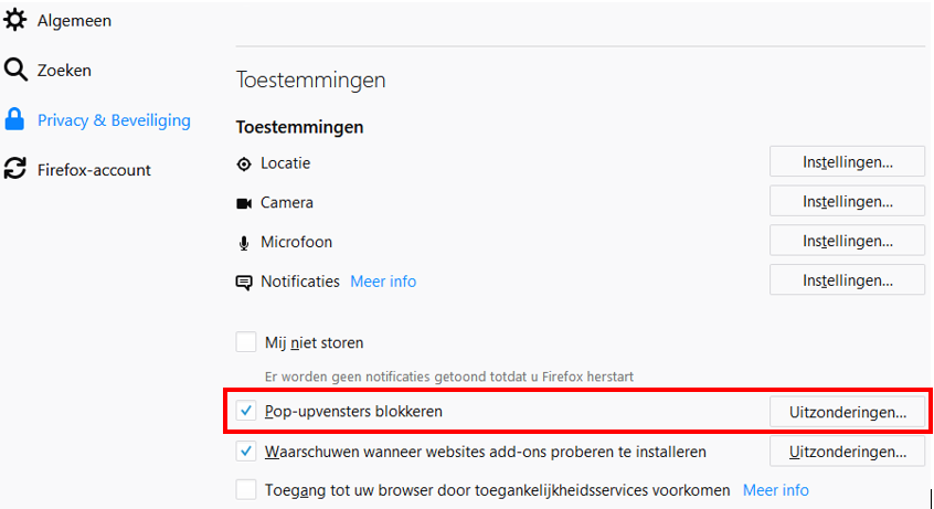 Ga in de webbrowser naar Extra -> Opties -> Privacy & Beveiliging -> Toestemmingen: