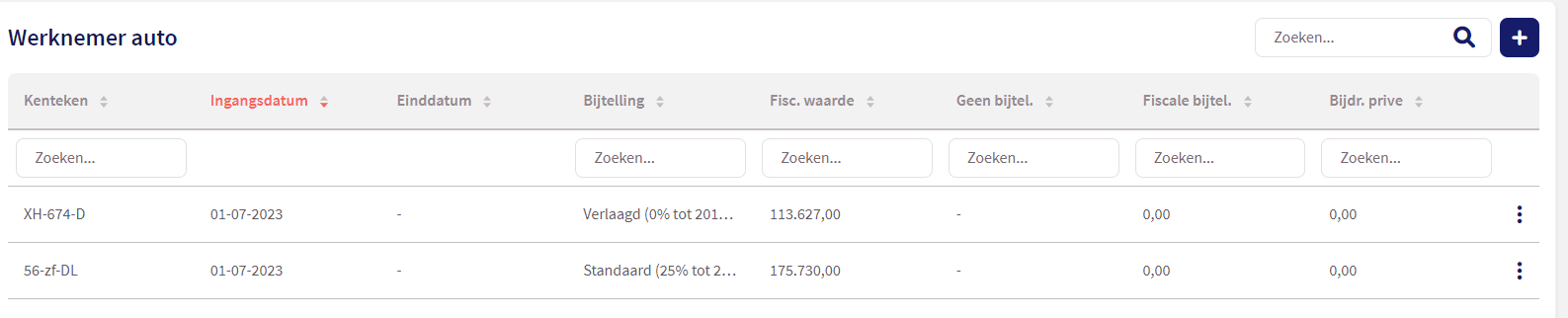 673 FISC.BYT.AUTO. Je hoeft dit enkel te doen voor de eerste maand waarin de 2 auto's worden verwerkt, alle maanden hierna zal voor beide auto's het totale bedrag aan fiscale bijtelling worden berekend.