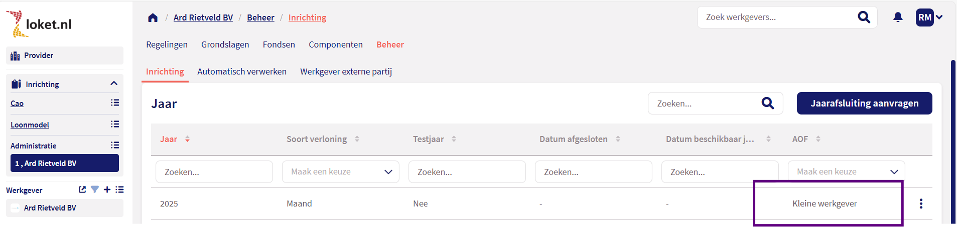 Sinds 2023 geldt er een gedifferentieerde Aof-premie. Je geeft onder Administratie - Beheer - Selecteer jaar of de werkgever een kleine werkgever of (middel)grote werkgever betreft. Krijgt je klant een bericht van de Belastingdienst dat de foute Aof-premie is berekend, wijzig dan de Soort werkgever. Bij de volgende verloning en loonaangifte wordt er dan gecorrigeerd. Loket kan niet automatisch bepalen of het het een kleine of grote werkgever is.