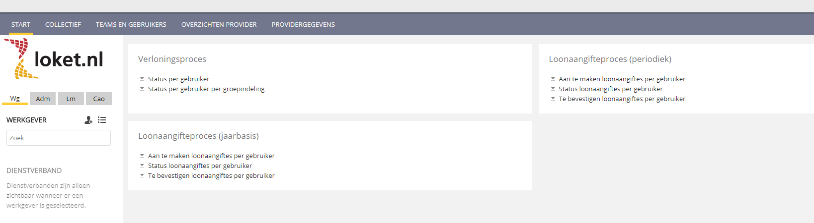 Op de startpagina Provider kan de hiervoor geautoriseerde gebruiker middels een aantal overzichten direct inzicht krijgen in de status van het verlonings- en loonaangifteproces. Via het zoekveld aan de linkerkant op de startpagina Provider kan een werkgever worden geselecteerd.