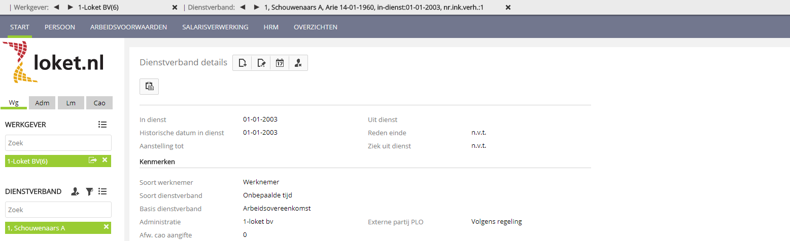 Als startpagina Werknemer wordt het scherm Dienstverband getoond.
