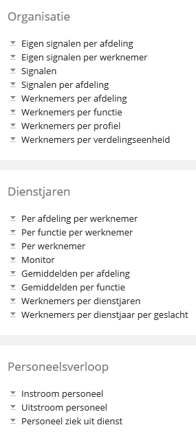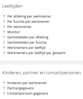 Door het product 20 Personeelsregistratie te activeren worden er een groot aantal standaard overzichten beschikbaar gesteld. Via Loket Classic -> Werkgever -> Overzichten -> Personeel zijn de overzichten te benaderen. Hieronder enkele voorbeelden: