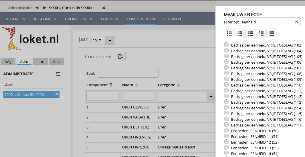 Als je nieuwe urencomponenten aan wilt maken of simpele berekeningen (km x € 0,19) in wilt richten, kun je wellicht gebruik maken van de eenheden. Bij een eenheid geef je een aantal op en laat je het systeem de rest doen. Je kunt Loket laten rekenen met een vast bedrag of het uurloon.