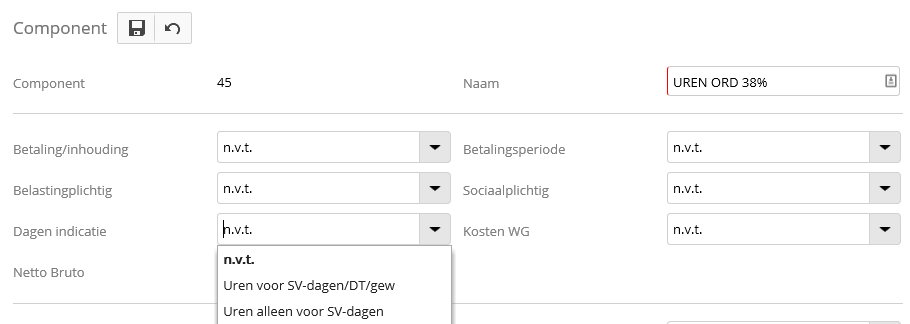 - Worden er uren verloond op dit component? (Bijv: Bij een toeslag van 20% wordt geen uur uitbetaald, alleen een toeslag. De Dagen indicatie laat je in dit geval op Nvt staan.)