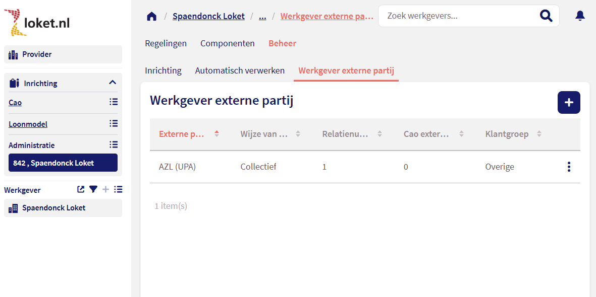 We bouwen steeds meer zaken van het ADM-niveau over van Loket Classic naar Loket. Dit zodat het overschakelen naar Classic steeds minder nodig is voor een AK-gebruiker. Deze release leveren we de werkgever externe partijen op. Deze vind je terug onder Inrichting - Administratie - Beheer - Werkgever externe partij.