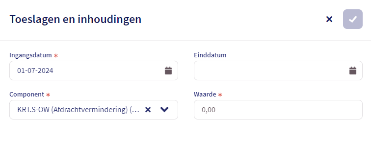 Heb je de beschikking eenmaal binnen, dan kun je dit bedrag aan WBSO eenvoudig in Loket opgeven. Dit door bij een willekeurige werknemer naar Arbeidsvoorwaarden - Toeslagen en inhoudingen te gaan. Je klikt op de toevoegen button en je geeft een startdatum, einddatum, het component KRT.S-OW en bij waarde het bedrag aan korting wat per aangiftetijdvak toegepast mag worden op.