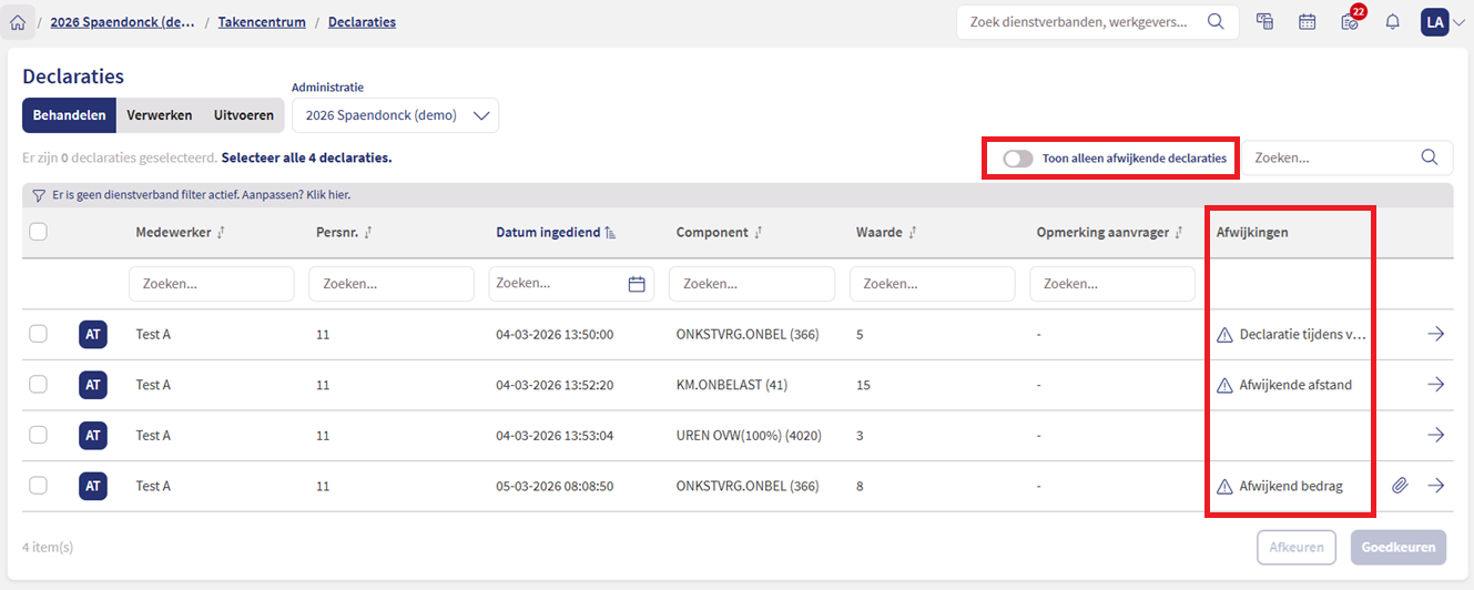 Ook is er een optie toegevoegd waarmee je alleen declaraties te zien krijgt die afwijkingen kennen. Zet hiervoor de optie Toon alleen afwijkende declaraties aan