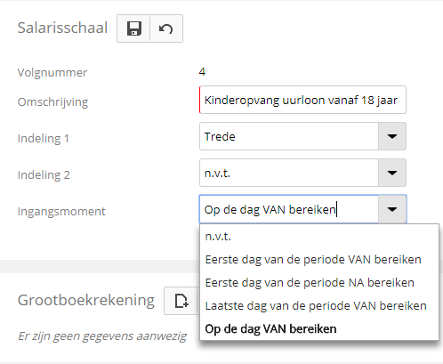 Aan de hand van de inrichting bij de salarisschaal dient hier het dienstjaar, de leeftijd of de trede te worden gevuld.