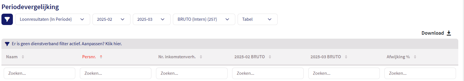 Om de controles tijdens het verloningproces nog verder te vereenvoudigen is het mogelijk een periode vergelijkingsoverzicht op werkgeversniveau in te zien. Het overzicht kan gebruikt worden voor een vergelijking van loonresultaten over een periode ten opzichte van loonresultaten van de vorige periode.