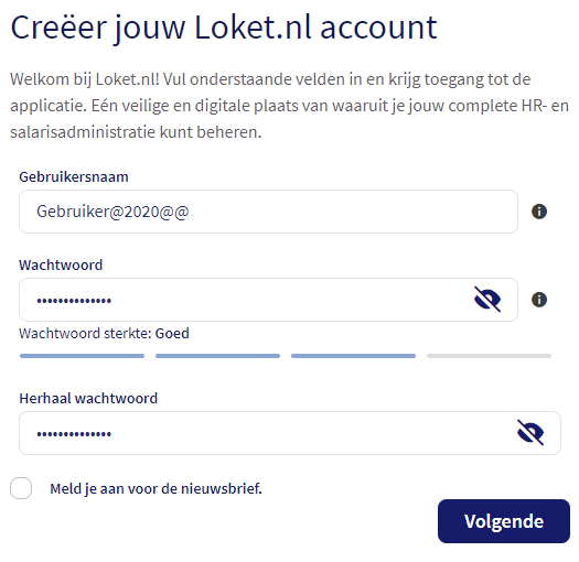 Als nieuwe gebruiker kies je voortaan zelf je gebruikersnaam en wachtwoord. Let op: de gebruikersnaam moet uniek zijn. Achter het i icoontje staat beschreven waar een gebruikersnaam en wachtwoord aan moet voldoen.