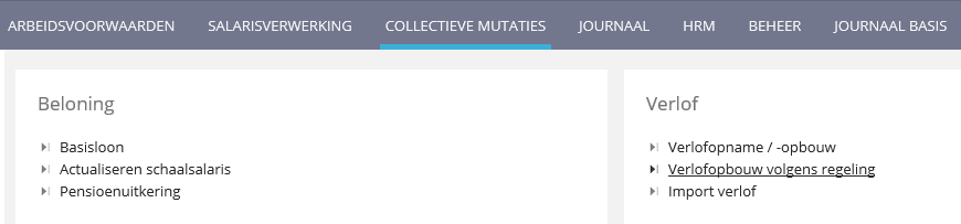 De rechten van het wettelijk verlof, bovenwettelijk verlof en/of ADV kun je collectief opbouwen voor alle medewerkers die gekoppeld zijn aan een verlofregeling. Hiervoor ga je op werkgeverniveau in Loket Classic naar Collectieve mutaties en kies je in het veld Verlof voor Verlofopbouw volgens regeling.