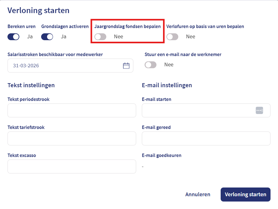 Bij het starten van een loonrun wordt de jaargrondslag voor het betreffende fonds automatisch berekend. Deze informatie is zichtbaar op werknemerniveau via: Dienstverbandmenu> Salarisverwerking > Fondsen> Werknemer fondsgrondslag